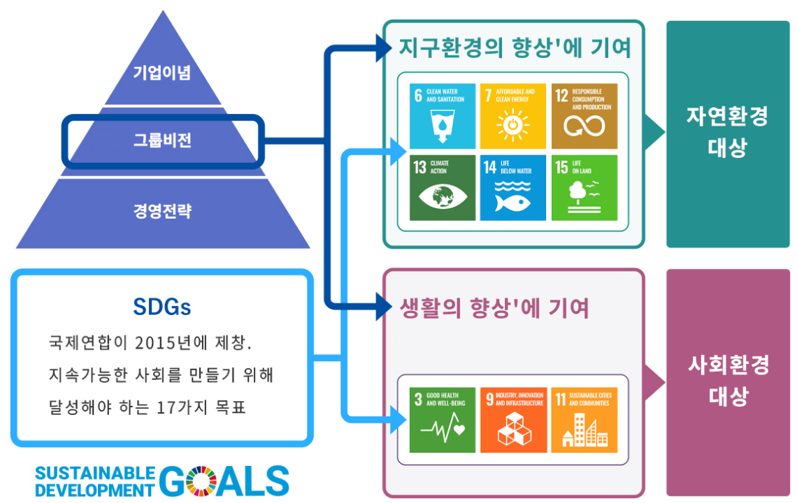 세키스이화학 그룹의 비전은 '지구환경의 향상'과 '세계의 사람들의 생활의 향상'입니다. 이 비전은 2015년에 국제연합에서 제창된 지속가능한 개발목표(Sustainable Development Goals=SDGs)로 거론되고 있는 과제해결을 위해 본업인 사업을 통해 기여하는 것이 저희 목표입니다. 사회과제해결을 위해 사업활동과 일체화한 지속가능성을 향한 다양한 활동을 추진하고 있습니다.