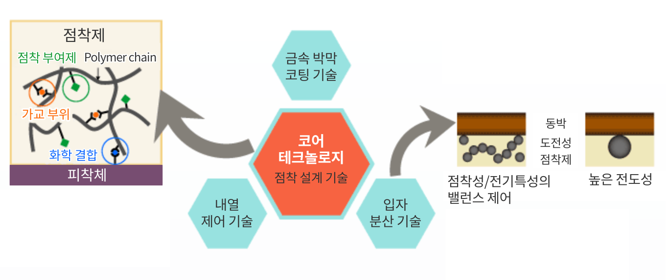 점착제를 분자 수준으로 제어함으로써 고신뢰 설계, 내열 설계등 다양한 특성을 부여할 수 있습니다.