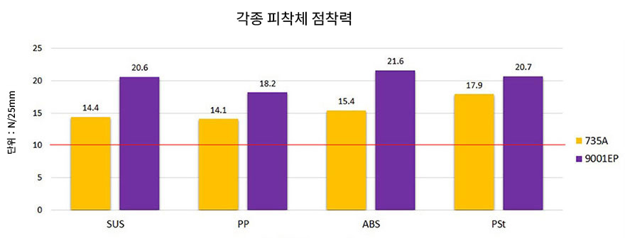 PP등의 피착체를 비롯하여 각종 피착체에 우수한 점착 성능을 자랑합니다.