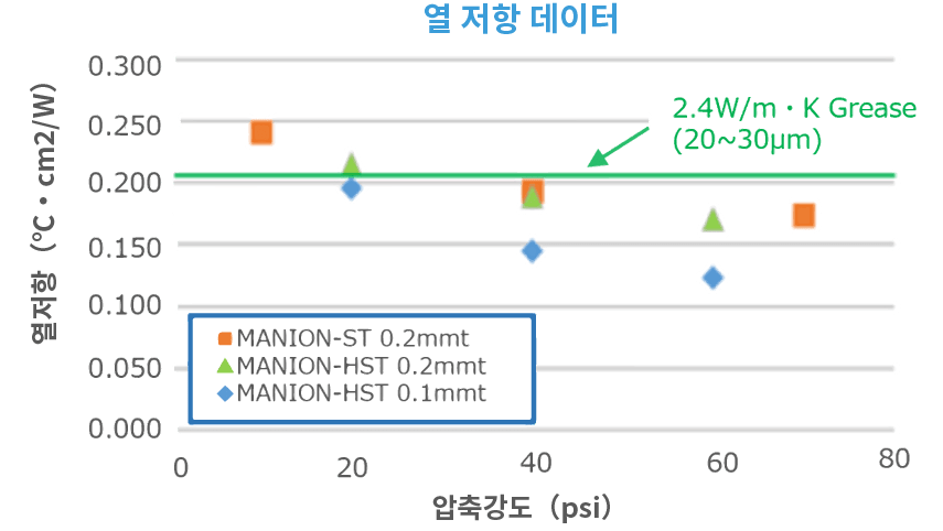 CPU와 GPU 등, 고발열 부위의 냉각도 가능합니다. ‘MANION-HST’는 박막으로 사용가능한 제품으로 그리스 대체로도 사용이 가능합니다.