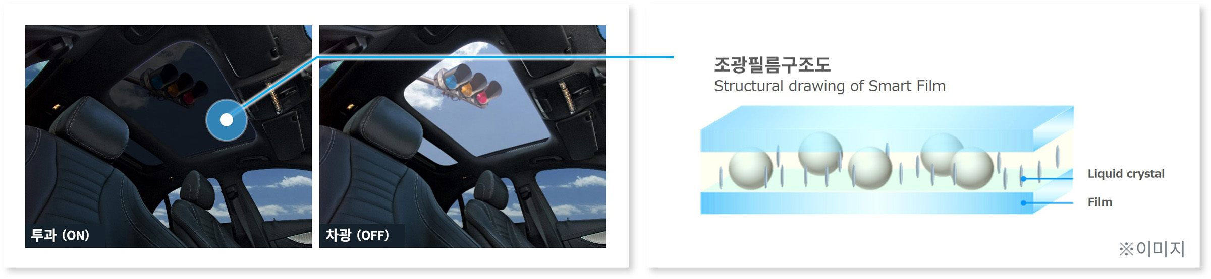 프라이버시확보, 차량 내 온도상승 감소에 대한 높아지는 수요에 대응하고, 즉시 온/오프 전환이 가능한 편리성으로부터 자동차용 외장유리에 조광필름/유리의 활용이 늘고 있습니다. 조광필름/유리에는 명암비・응답성・곡면 추종성・내구성 등 많은 성능이 요구됩니다.