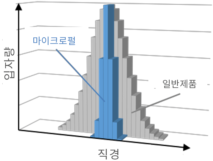 입자 지름 분포가 좁다 | 입자 지름 분포가 넓다 | |