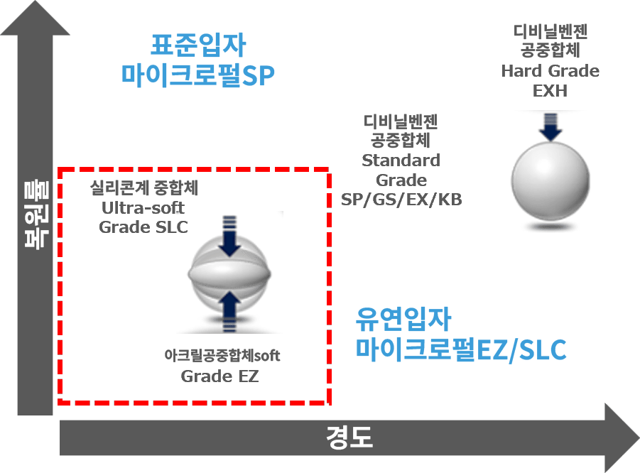 EZ는 폴리머 입자로, 유연하기 때문에 진동 노이즈컷, 기판 손상 저감에 효과가 있습니다. 또한, 낮은 복원율을 가지므로 필름 등의 유연 기재의 Gap제어 용도에도 매우 적합합니다.