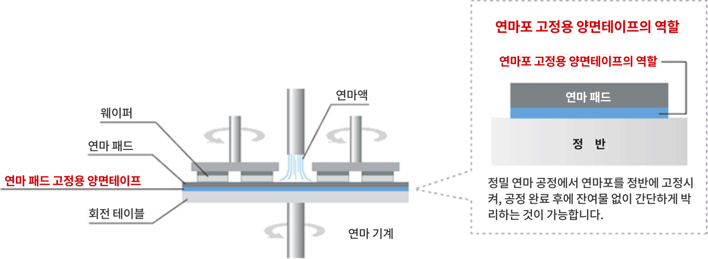연마포 고정용 양면테이프는 액정 글래스 기판 제조공정을 시작으로, 전자재료 제조공정에서 폭 넓게 사용되는 양면테이프입니다.