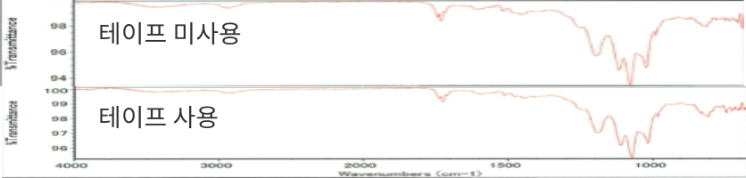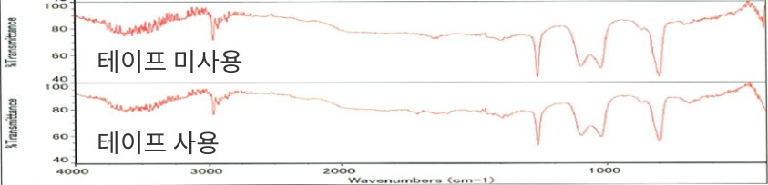 테이프를 사용하지 않은 기판과 테이프를 붙이고 박리한 기판표면을 비교분석하여도 스펙트럼에 차이는 보이지 않았습니다.