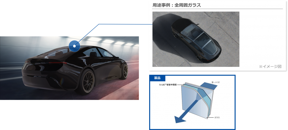 EVでは、S-LEC™遮音中間膜を採用することで、フロントガラス、サイドドアガラス、パノラマルーフなどすべての合わせガラスの遮音性を向上させ、より静かなクルマを実現することができます。