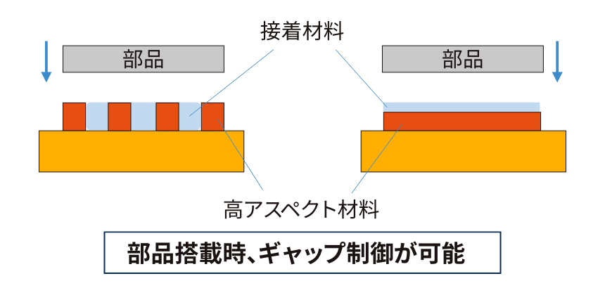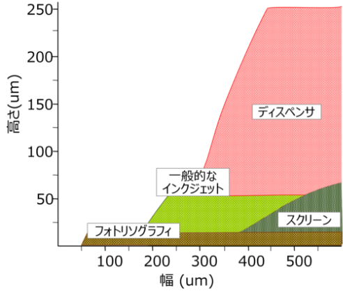 ディスペンサ等の他方式では達成が困難な、細く高い塗布が可能で「広範囲の印刷」と「生産プロセス削減」の強みを持ち、高い性能を発揮します。