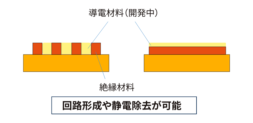 - オンデマンド式:任意の場所に円・直線などの形状印刷が可能です。またエッチング等のプロセスが不要で、工程削減にも貢献します。
