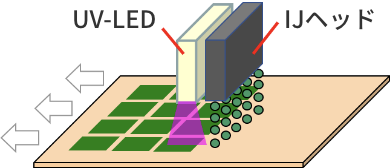 インクジェットは約20μmの微小な液滴である光硬化性インクをインクジェットヘッドのノズルから吐出して印刷する方式をいいます。