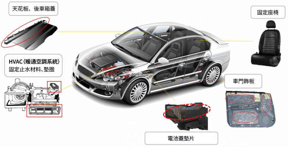 同時可以在PP和PU泡棉等難黏著素材上發揮強力的黏著力。採用低臭味、低VOC、低Fogging(霧化)設計,適用於車內環境及固定各種內裝構件,廣泛使用於做為可持續移動出行材料。