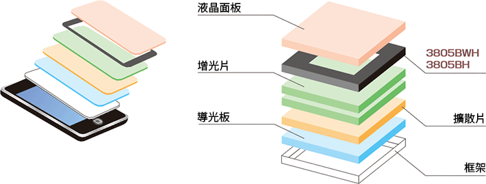 背光源模組用途 | 反射/遮光 | 耐回彈 | 3800BWH | 3803BWH | 3805BWH | 3806BWH | 3808BWH | 3810BWH | ||||