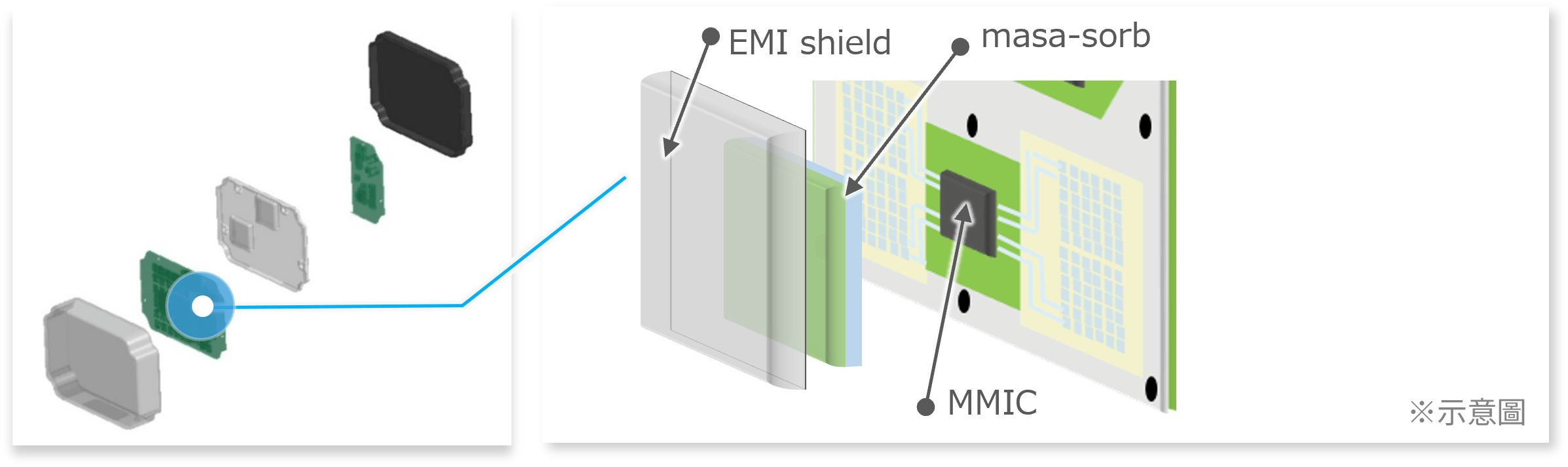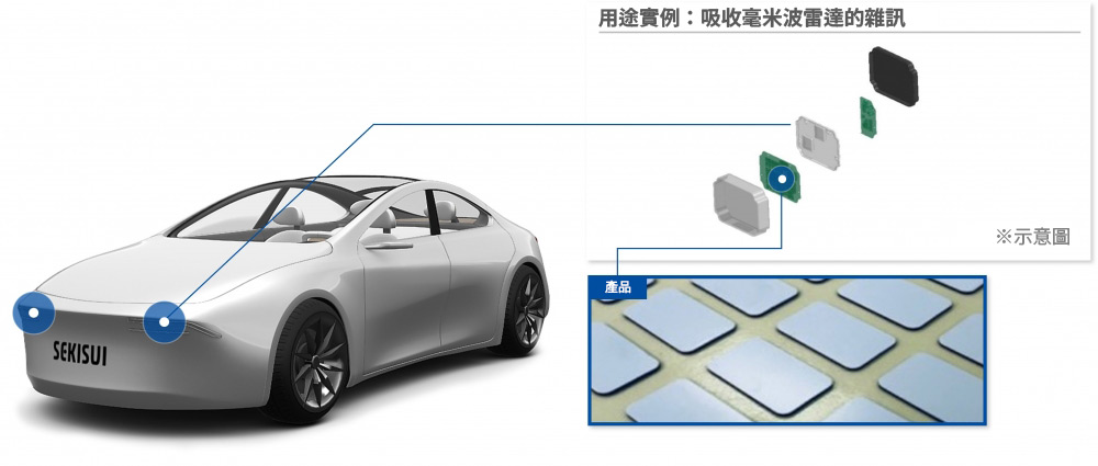 利用濺鍍技術開發的電磁波吸收片。對應20~100GHz範圍之寬頻帶,即使厚度僅有0.8mm的薄型,依然可以在150度之高溫下提供穩定的功能。有助於改善車載雷達的天線模式及提高檢測精確度。