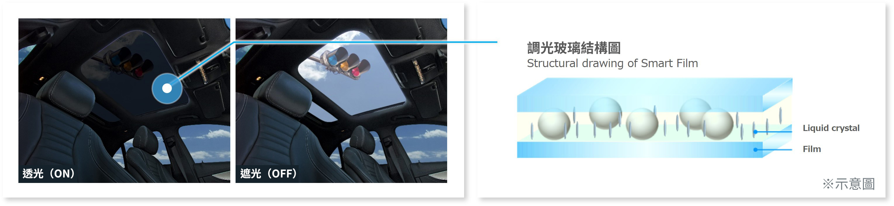 為了對應確保隱私及降低車內溫度上升的需求增加,並且出於能夠瞬間進行ON/OFF切換的便利性,汽車用外裝玻璃上採用調光膜及調光玻璃的設計日漸增加。