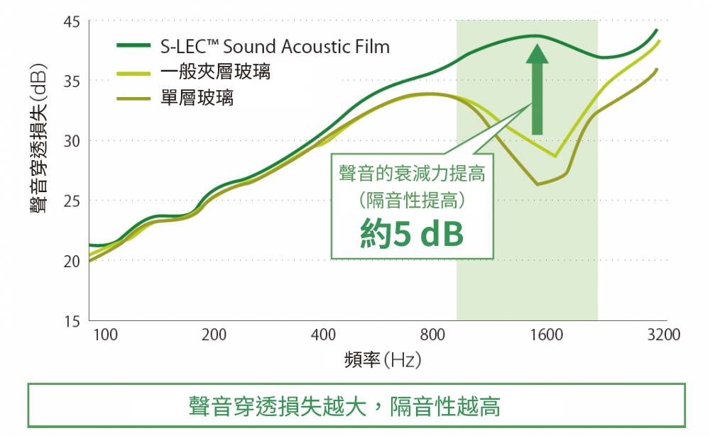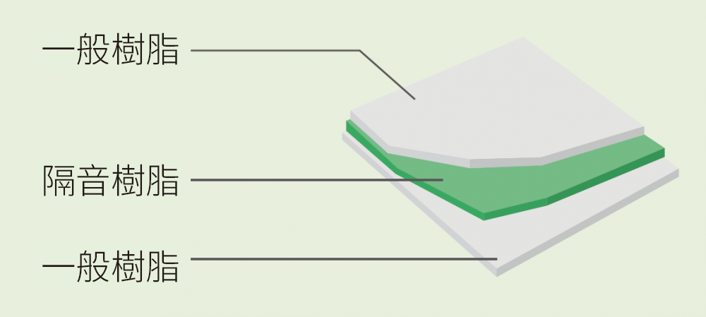 S-LEC™隔音中間膜是由3層構成,在維持安全性及UV隔絕性等中間膜優點的同時,還使中央隔音層(芯層)的隔音性能大幅提升。