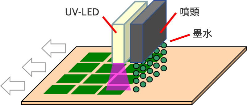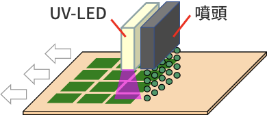 Inkjet噴墨是指從噴墨頭噴嘴噴出約20μm的微小光硬化性油墨以進行印刷的方式。