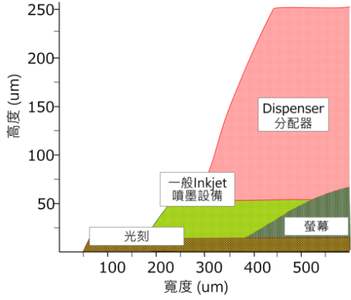 透過可堆高及細微塗佈的高黏度Inkjet方式,可以發揮“廣範圍印刷”和“減少製程”等優點,此為Dispenser等其他方式難以望其項背的優勢。