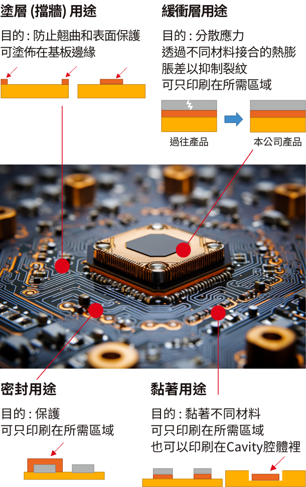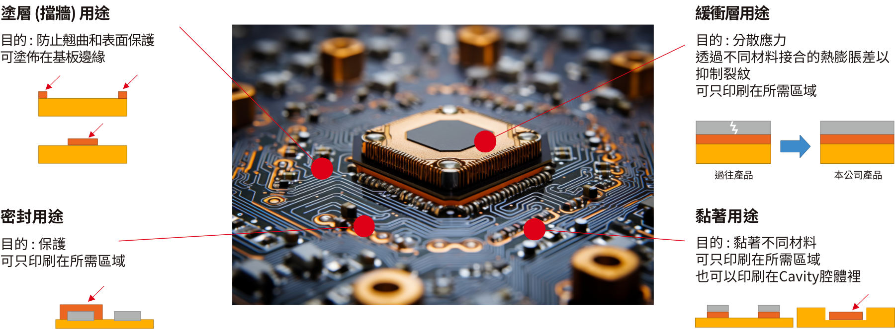 高黏度Inkjet噴墨方式可用於手機、顯示器、基板封裝等各種用途。
